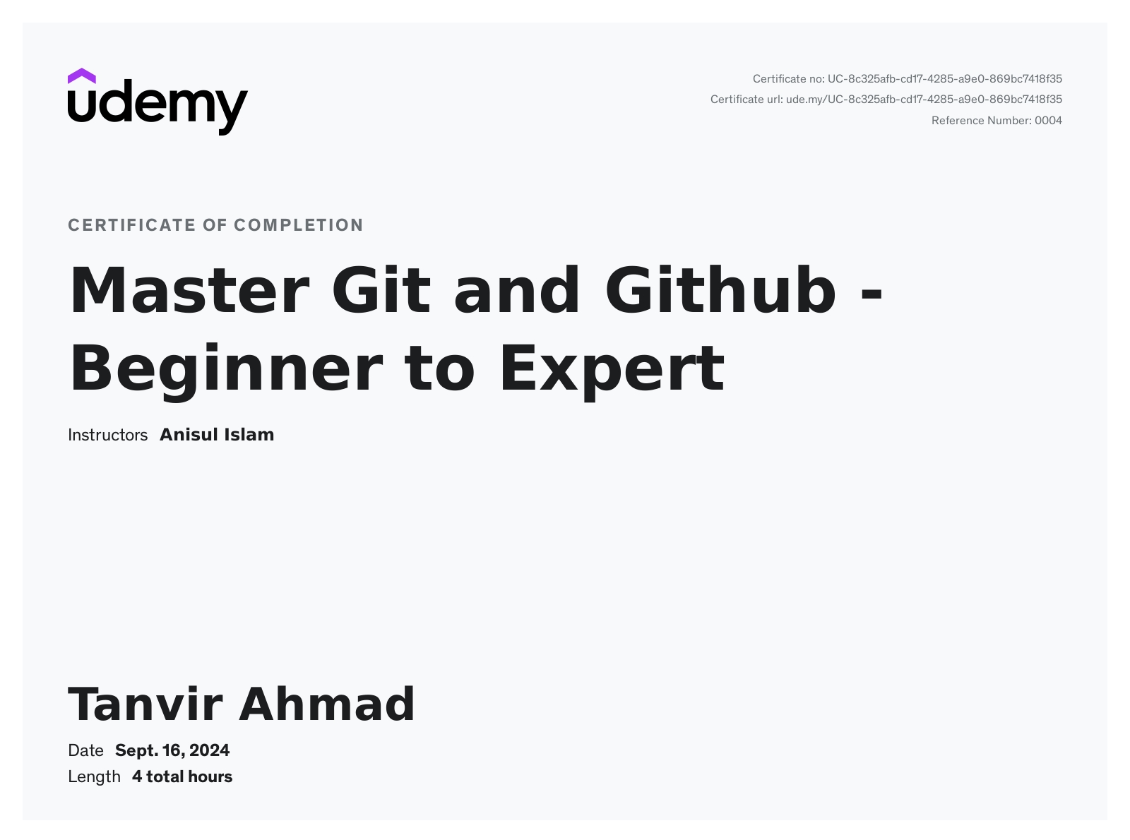 Check out this certificate I got for Master Git and Github - Beginner to Expert. ID: UC-8c325afb-cd17-4285-a9e0-869bc7418f35