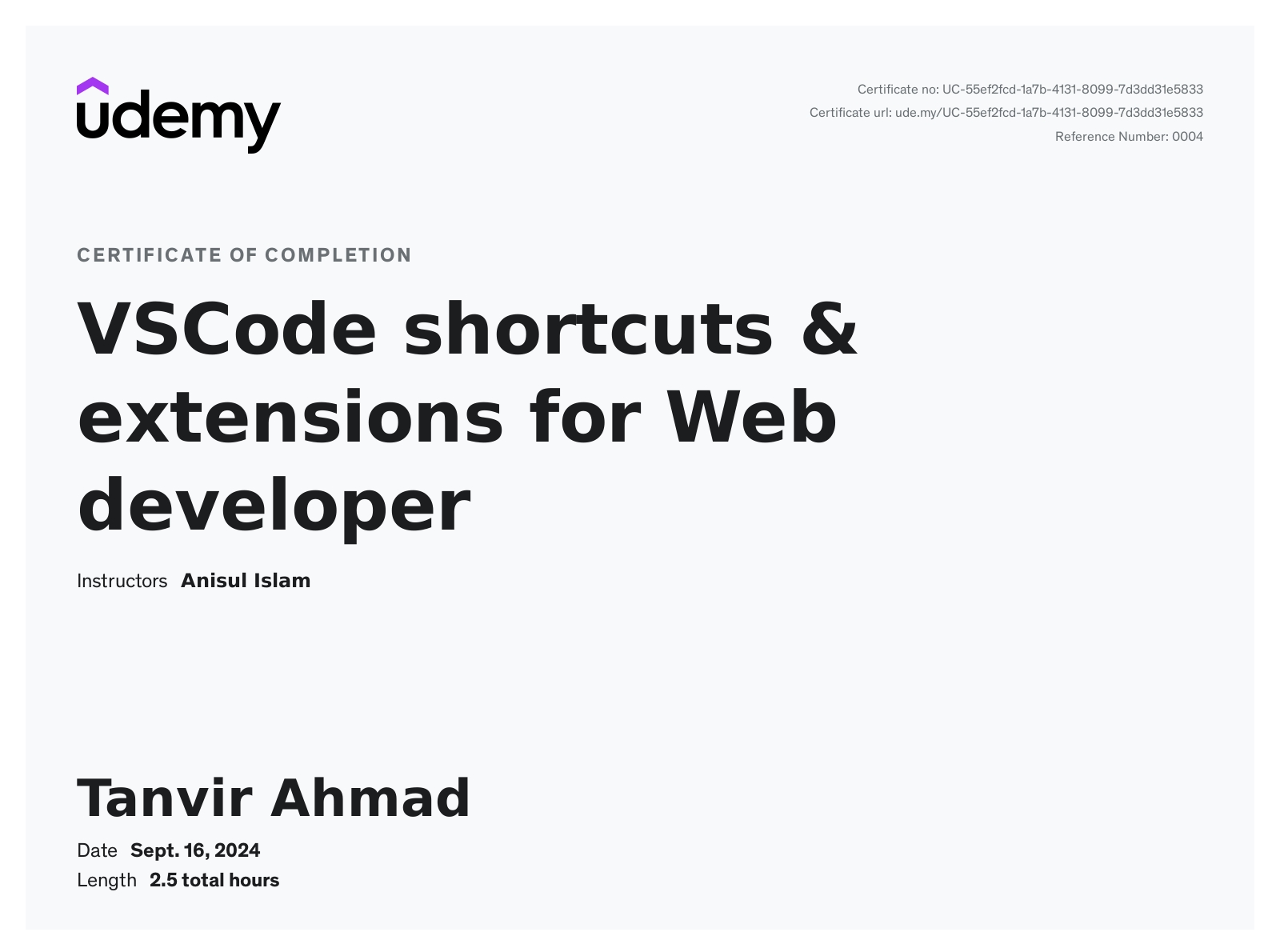 Check out this certificate I got for VSCode shortcuts & extensions for Web developer. ID: UC-55ef2fcd-1a7b-4131-8099-7d3dd31e5833